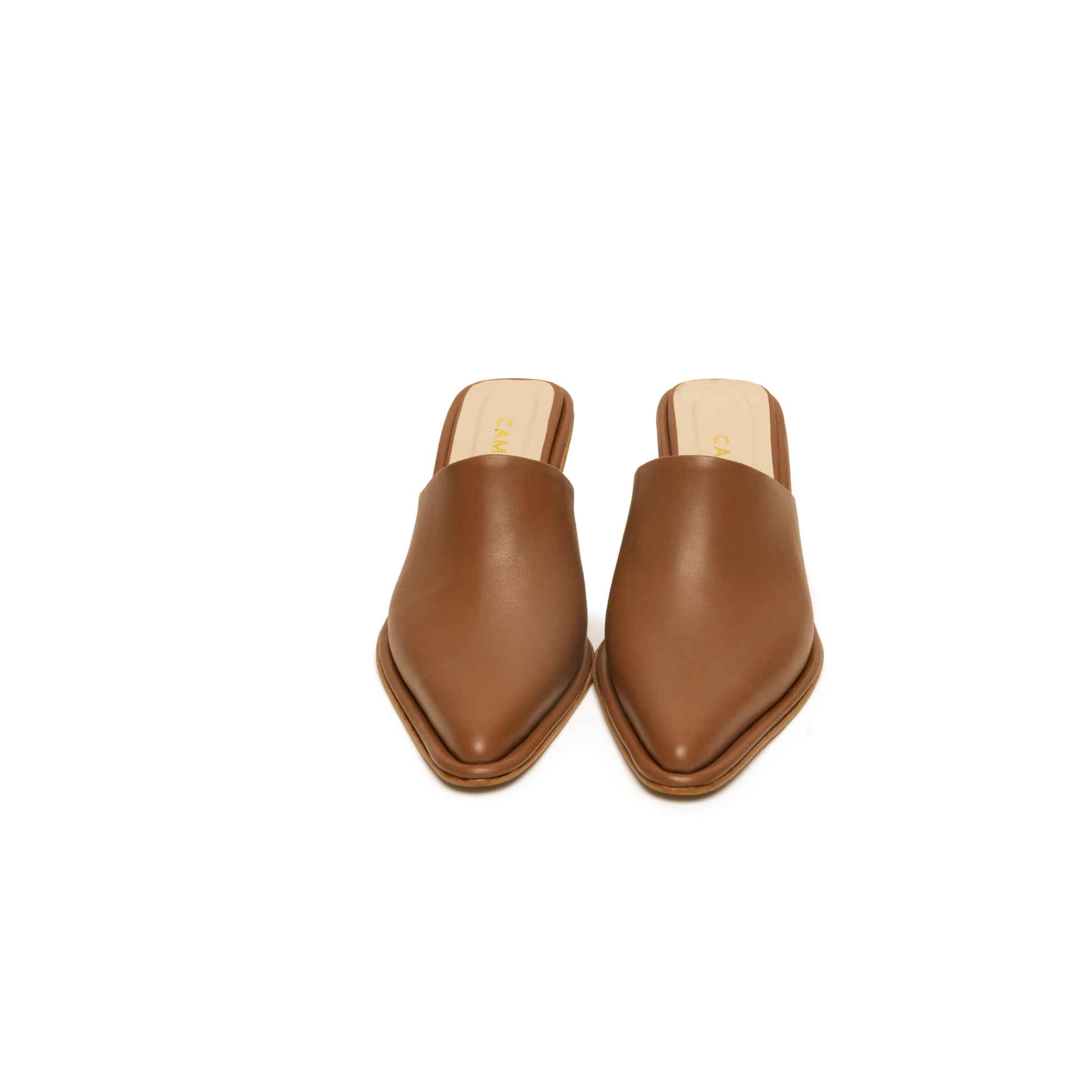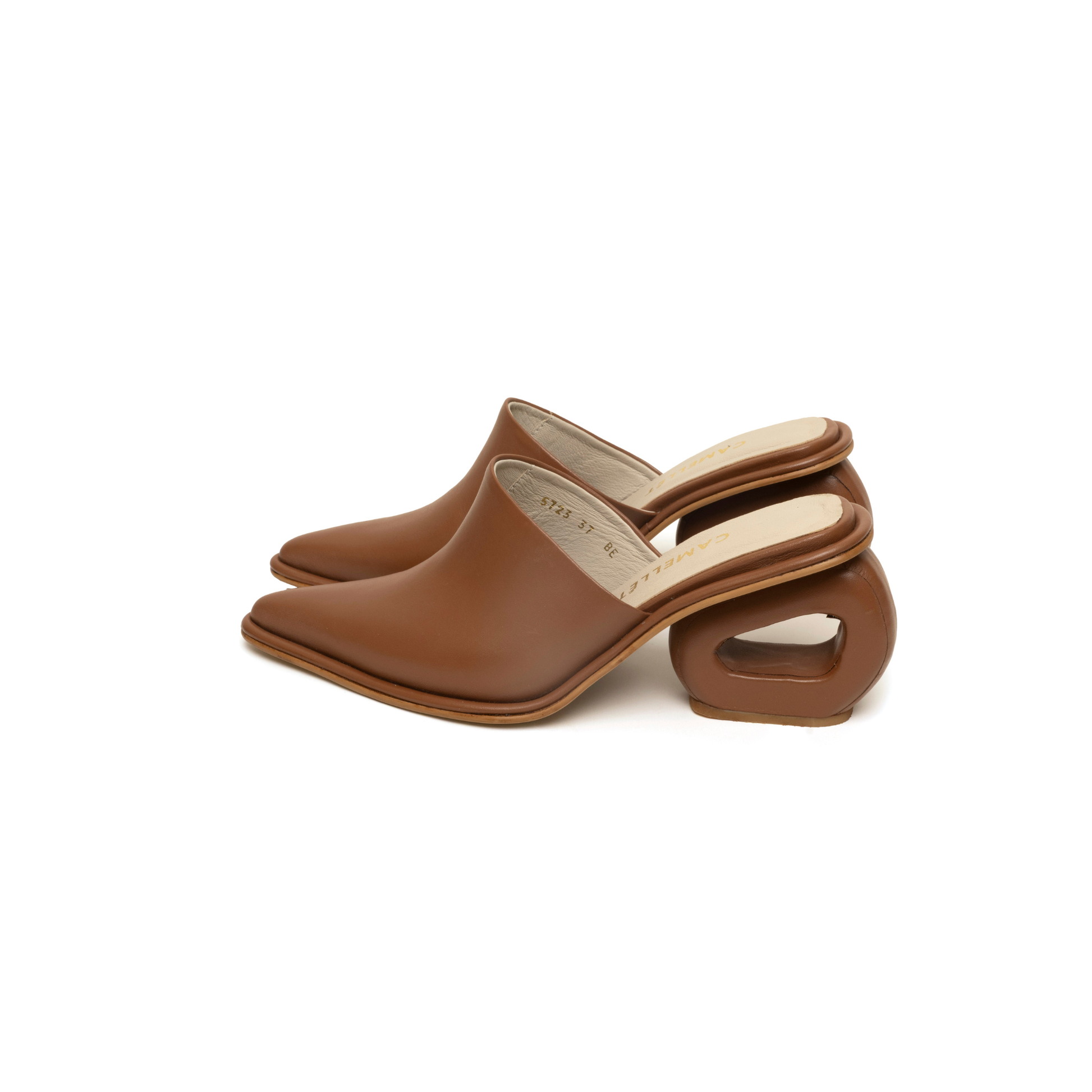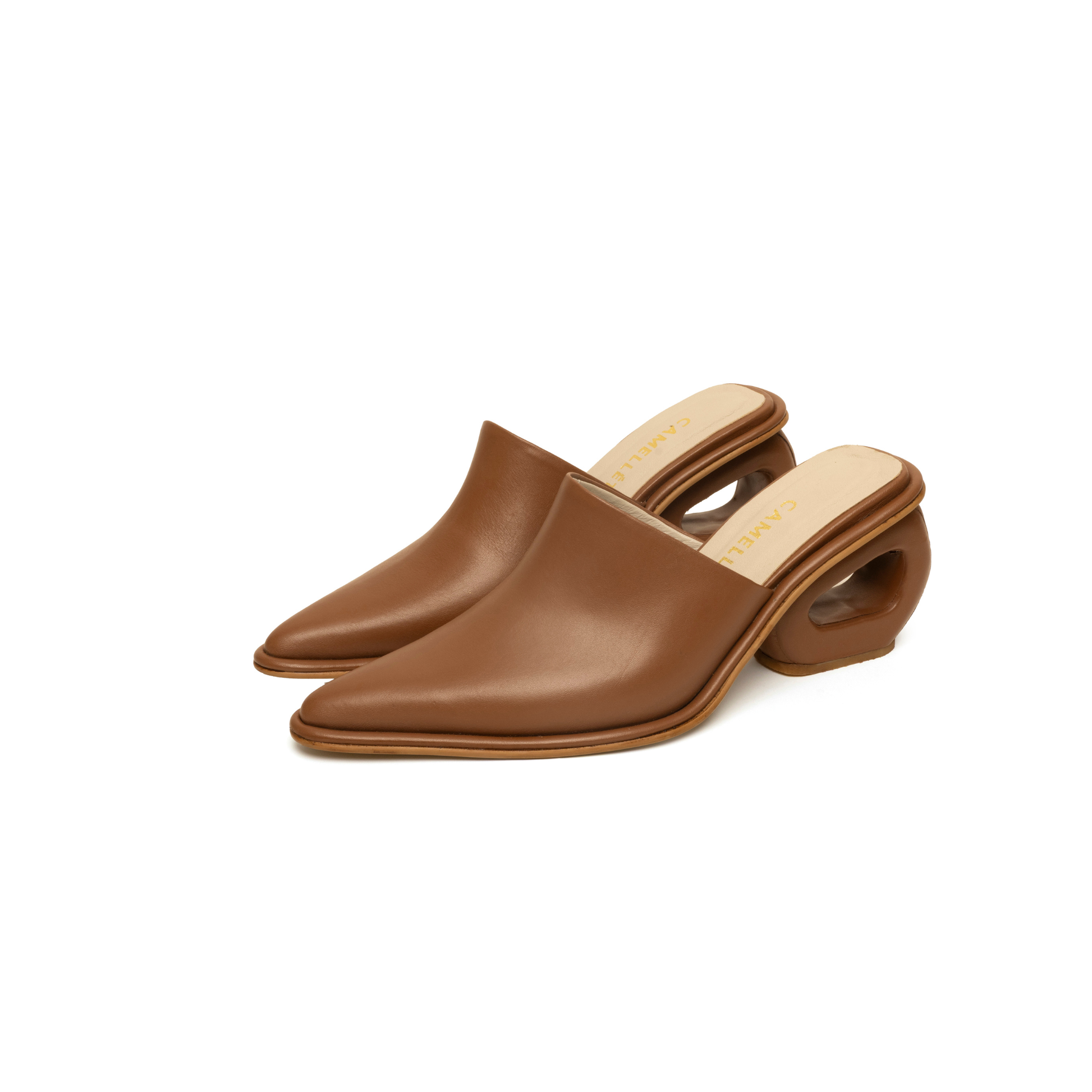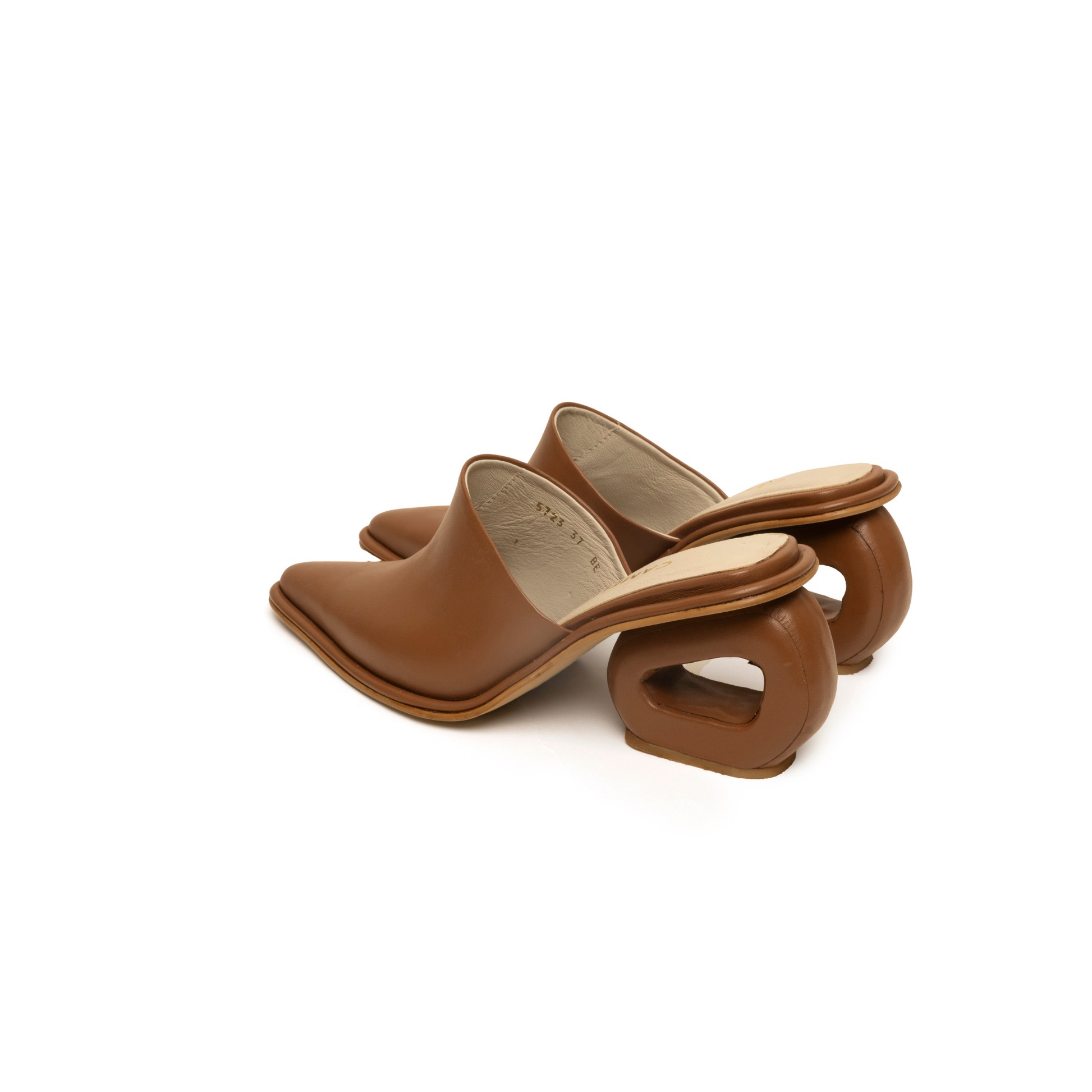 Suecos abiertos en cuero italiano, definidos por nuestro tacón icónico en forma de circunferencia. Tacón de 6.5 cm.