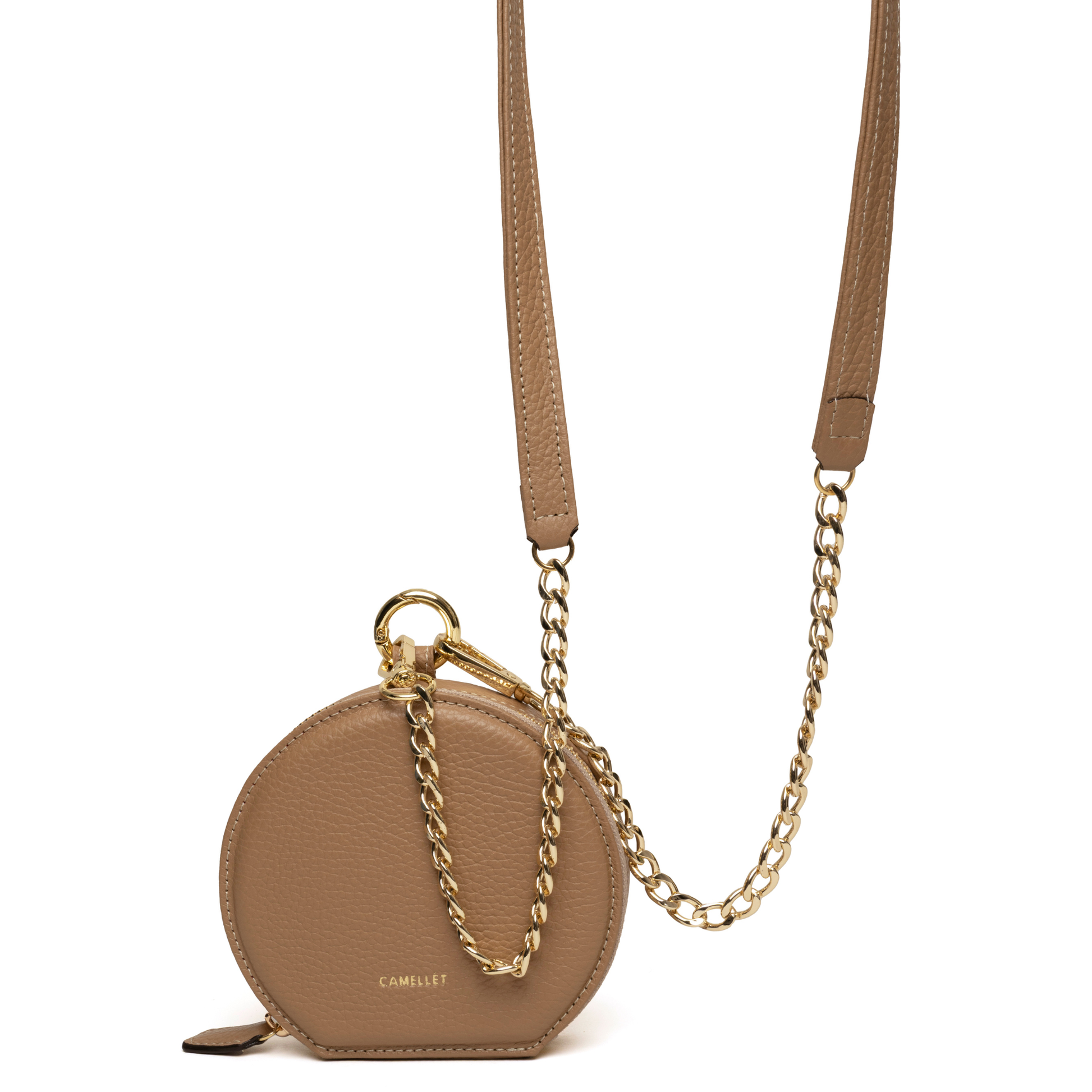 Tiene 4 formas de uso con sus accesorios, es en cuero italiano, en el interior tiene una billetera, monedero y un compartimiento adicional.