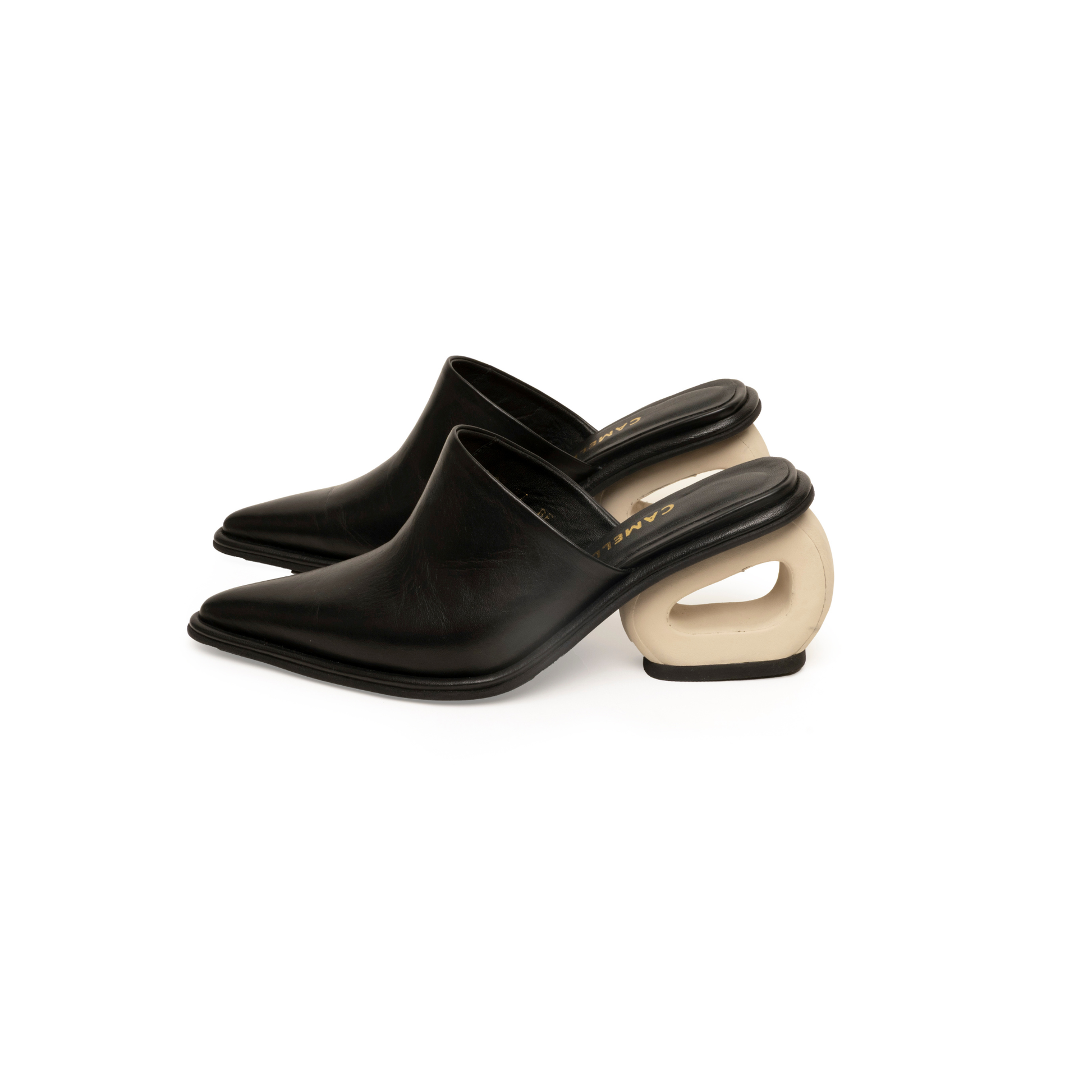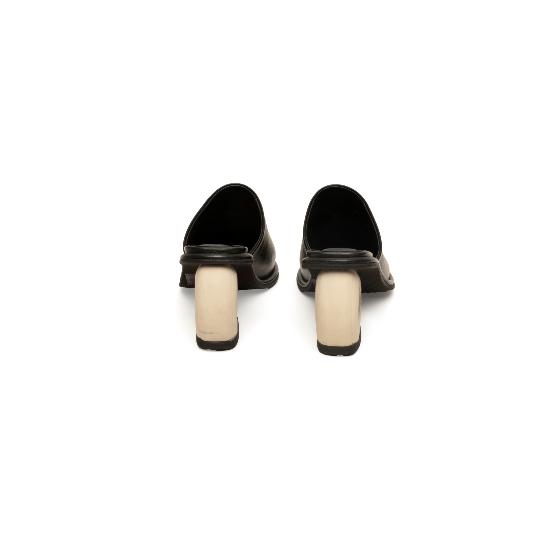 Suecos abiertos en cuero italiano, definidos por nuestro tacón icónico en forma de circunferencia. Tacón de 6.5 cm.