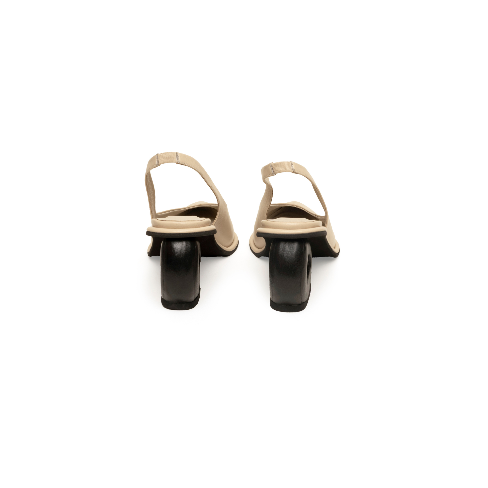 Tacón con elástico en cuero italiano, definidos por nuestro tacón icónico en forma de circunferencia. Tacón de 6.5 cm.