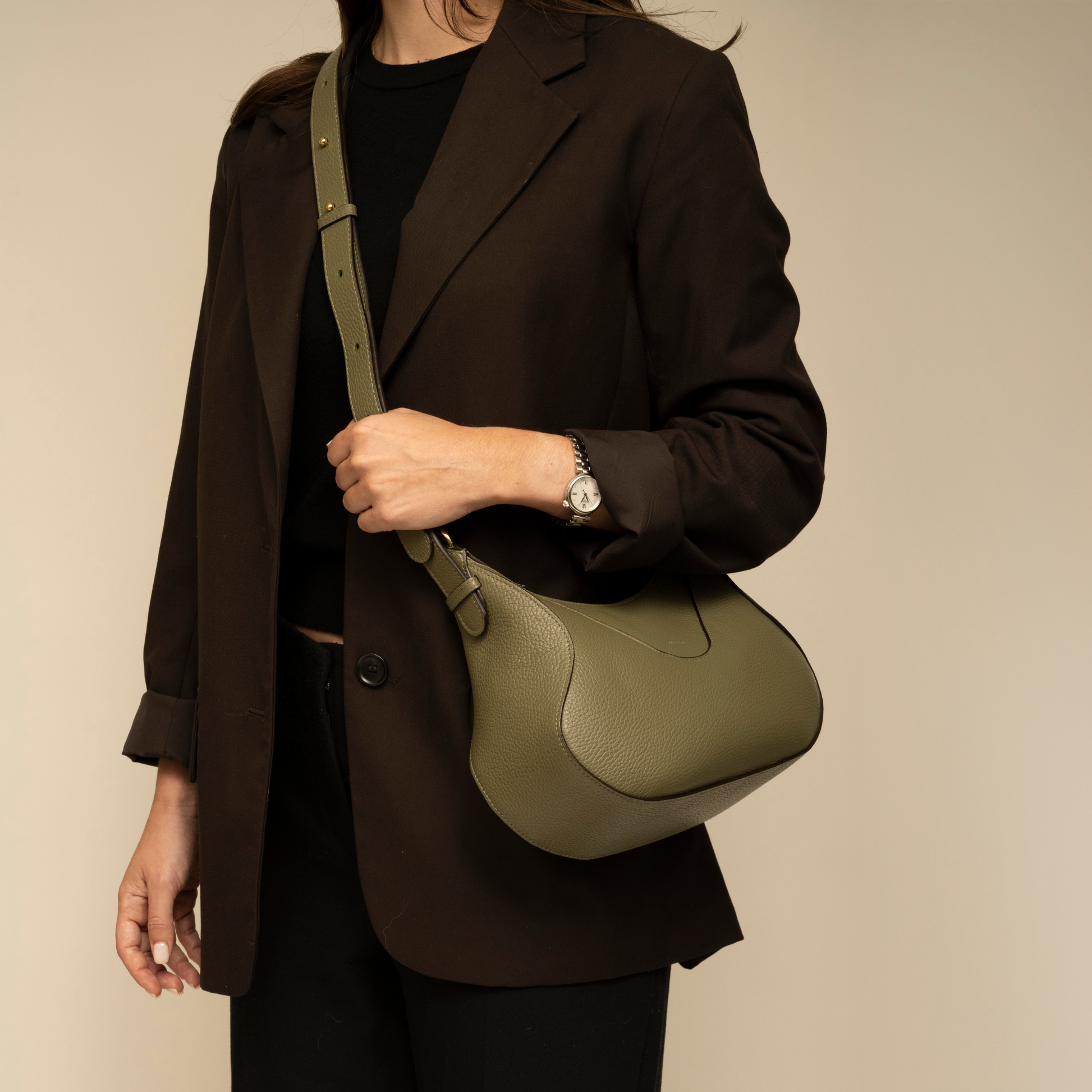 Es el tamaño perfecto, cómodo y liviano, en cuero italiano suave y forro de gamuza en su interior.