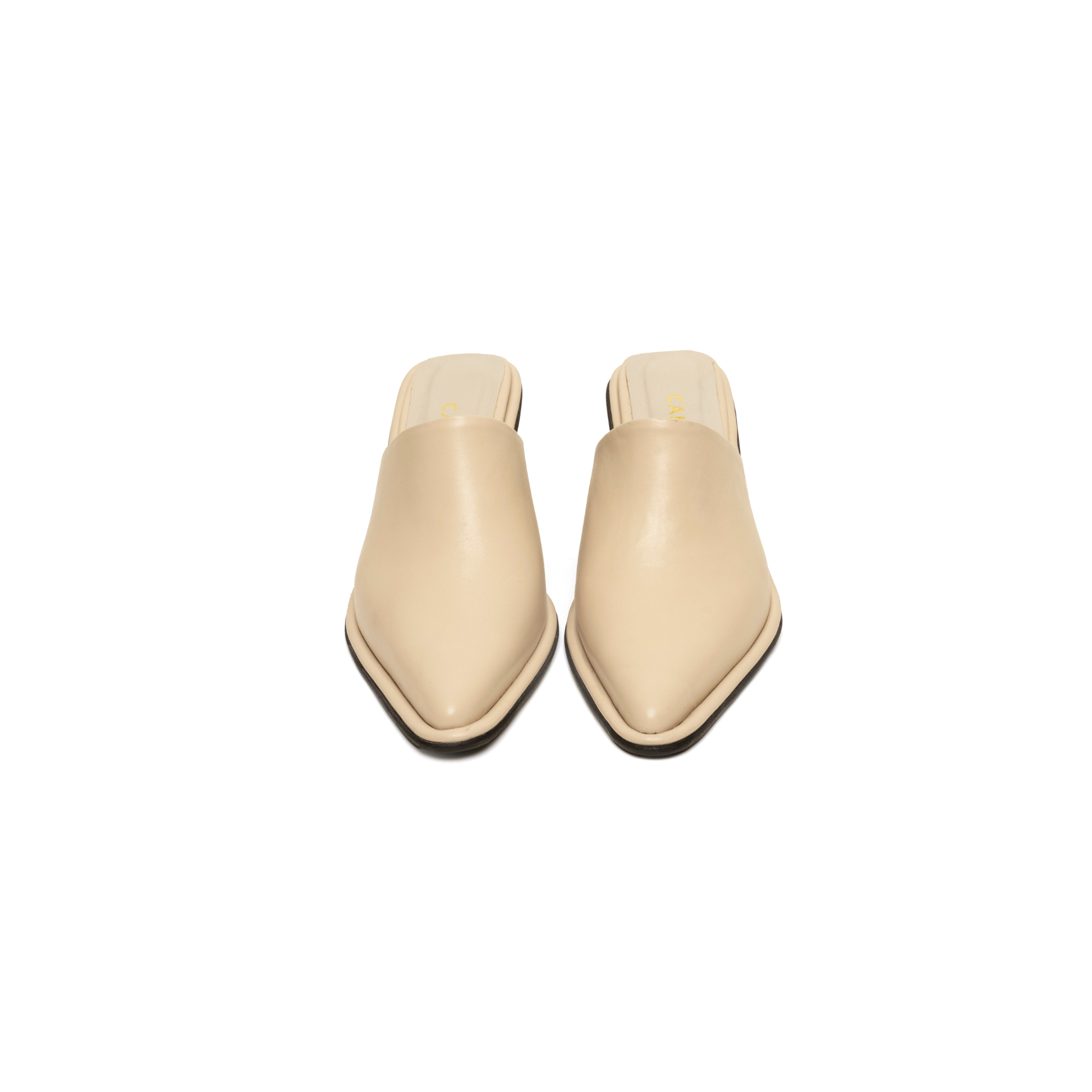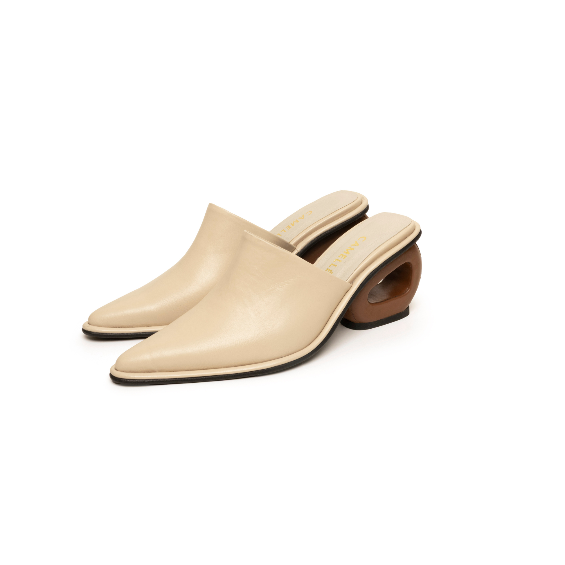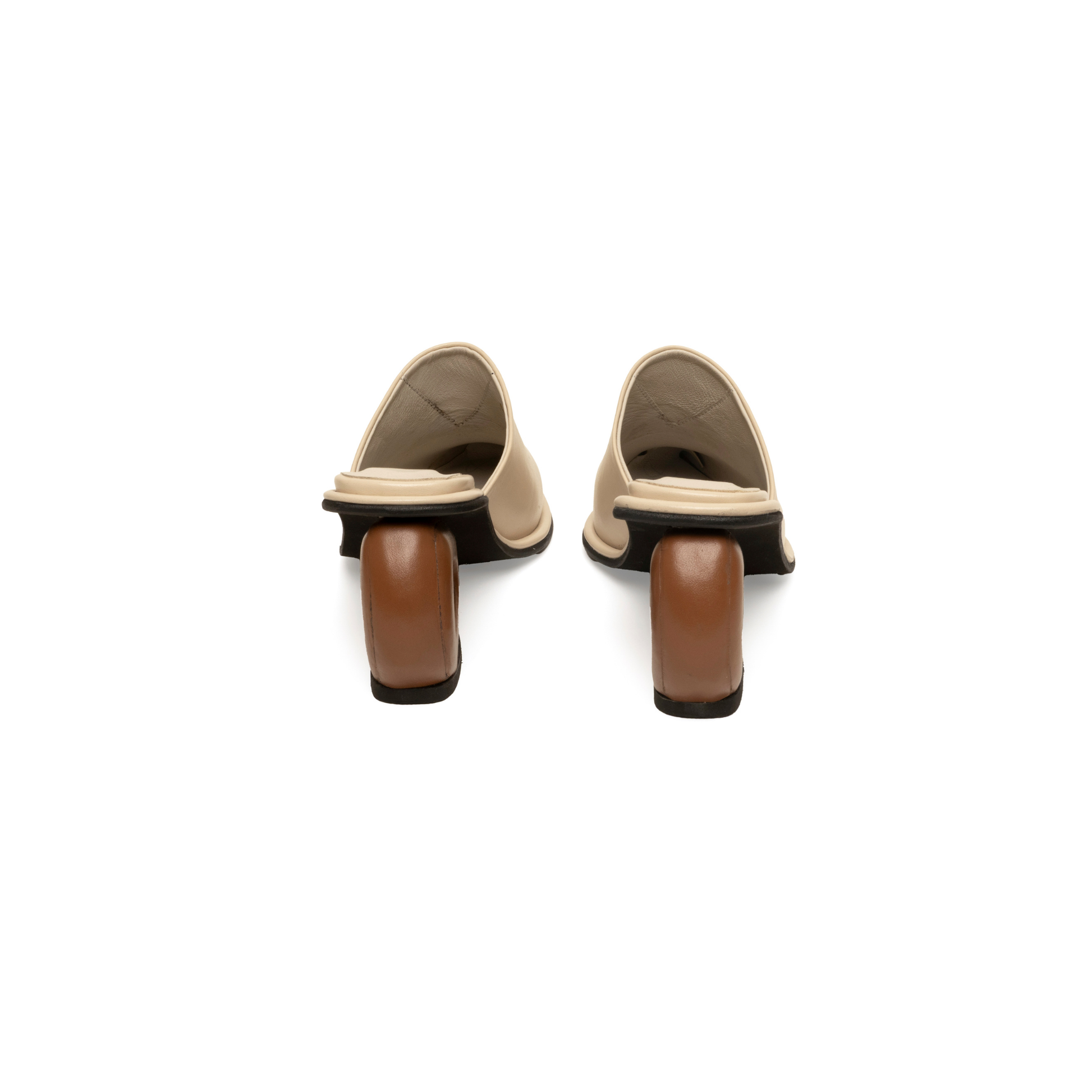 Suecos abiertos en cuero italiano, definidos por nuestro tacón icónico en forma de circunferencia. Tacón de 6.5 cm.